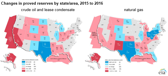 По состоянию на конец 2016 года у США было 341,1 триллион куб. футов доказанных запасов природного газа, что на 5% больше, чем в 2015 году, согласно недавно опубликованному отчету EIA. Запасы нефти и промысловых конденсатов в США оставались практически неизменными с уровня 2015 года — 35,2 миллиарда баррелей.