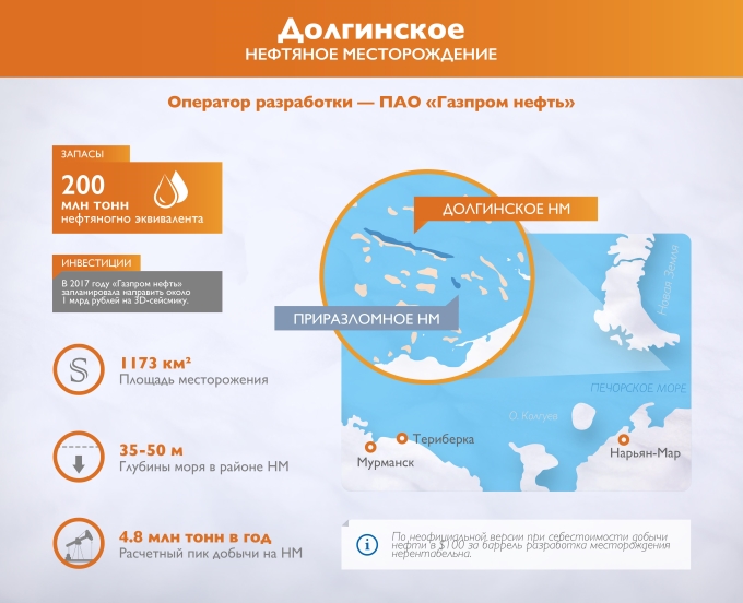 История освоения: Месторождение было открыто в 1999 году. В 2006 году была проведена 3D-сейсмика, в 2008 и 2014 годах — пробурены третья и четвертая разведочные скважины. Параллельно «Газпром нефть» искала партнера для разработки месторождения. Предполагалось, что им станет компания Shell, однако из-за санкций выбор был сделан в пользу Вьетнама: 25 ноября 2014 года «Газпром нефть» и PetroVietnam подписали соглашение о начале эксклюзивных переговоров о возможности сотрудничества при разведке и разработке Долгинского месторождения. Однако совместное предприятие так и не было создано. «Газпром нефть» продолжает поиск партнера, прежде всего из Вьетнама и, возможно, Китая, однако пока безрезультатно — из-за низких цен на нефть.