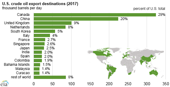 В 2017 году американская нефть ушла на экспорт по 37 направлениям, тогда как в 2016 – всего по 27. Как и в предыдущие годы, Канада оставалась крупнейшим импортером. Однако ее доля в общем объеме экспорта продолжала снижаться. В 2016 году она составила 61%, а в 2017 – уже 29%. Экспорт сырой нефти в Китай составил 202 000 б/д (20%). Китай превзошел Великобританию и Нидерланды и стал вторым по величине импортером нефти в 2017 году.
