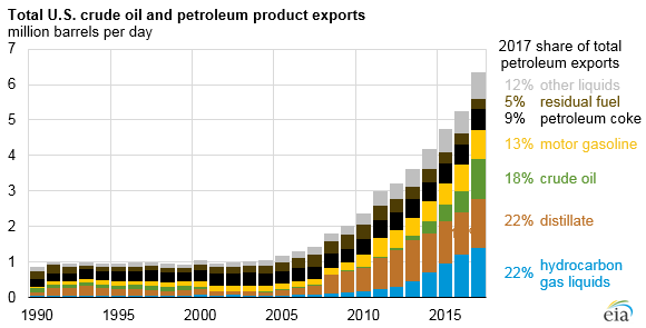 Сырая нефть теперь составляет 18% от общего объема экспорта нефти в США, что делает ее третьей по величине, после углеводородных газовых жидкостей (ХГЛ) и дистиллятного топлива. До того, как в декабре 2015 года были отменены ограничения на экспорт нефти, большая часть экспорта представляла собой нефтепродукты — главным образом ХГЛ (такие как пропан), дистиллятное топливо и автомобильный бензин.