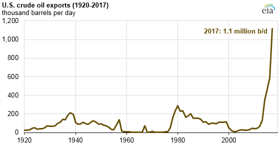 Экспорт американской сырой нефти в 2017 году увеличивался в среднем на 1,1 миллиона баррелей в день (мб/д). Это происходи с тех пор, как были отменены ограничения на экспорт сырой нефти. Экспорт нефти в 2017 году был почти в два раза выше уровня 2016 года. Такой резкий рост поддерживался увеличением добычи и расширением инфраструктуры.