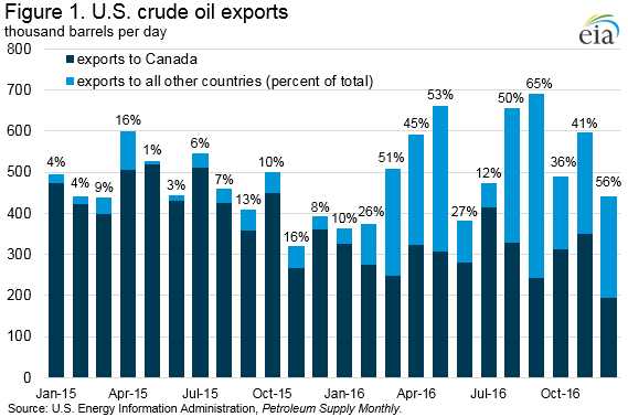 В декабре 2015 года были сняты ограничения на экспорт нефти из США, в результате чего в 2016 году США экспортировали нефть уже в 26 различных стран. В 2015 году 92% экспорта нефти из США пришлось на Канаду. После снятия ограничений на экспорт, Канада по-прежнему остается главным импортером американской нефти. При этом, в 2016 году лишь 62% американской нефти было экспортировано в Канаду.