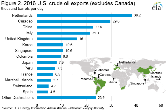 Другими приоритетными направлениями для экспорта нефти из США являются такие европейские страны как Голландия, Италия, Великобритания и Франция. Следующим регионом по объему экспорта нефти из США является Азия, включая такие страны как Китай, Корея, Сингапур и Япония. В 2016 году Соединенные Штаты также экспортировали нефть в регионы южной и центральной Америки, включая Кюрасао, Колумбию и Перу.