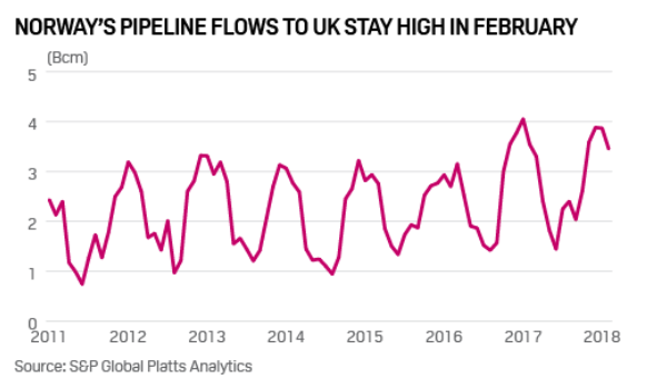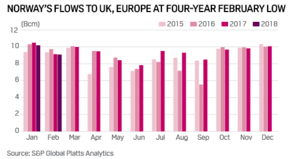 Великобритания, которая в зимний период все чаще становится рынком Норвегии, импортировала в феврале в среднем 123 миллиона кубометров в день.