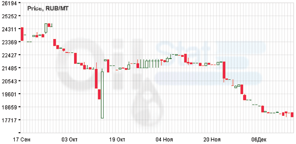 Цена же на зимнее дизтопливо за сутки не претерпела особых изменений. Продолжается падение цен на ДТЛ в связи с холодной погодой, по итогам дня цены еще немного отклонились вниз — на величину 0,3%. Таким образом, все идет по традиционному рыночному сценарию. Вместе с тем, специалисты предполагают, что с ослаблением морозов уровень цен на сезонные нефтепродукты может слегка вырасти.