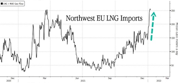 В первые дни января 2022 года страны западной Европы закупали СПГ в объеме 250 млн кубометров в сутки, подсчитал Bloomberg на основании данных по морским перевозкам от Kpler.