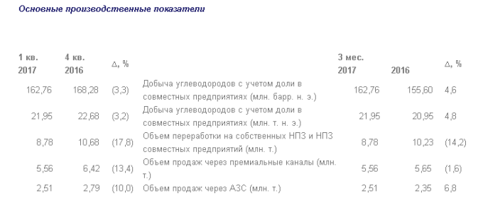 •  Объем добычи углеводородов с учетом доли в СП составил в 1 квартале 2017 года 21,95 млн тонн н.э. Рост – 4,8% к 1 кварталу 2016 года;