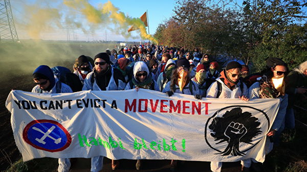 Активисты принимают участие в акции протеста против вырубки Хамбахского леса, Германия