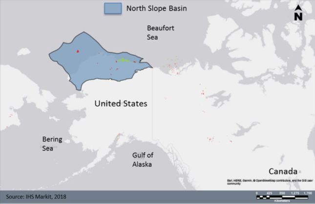 По информации IHS Markit, извлекаемые запасы углеводородного сырья Северного склона Аляски, расположенного рядом с границами Российской Федерации, оцениваются в 38 млрд баррелей нефтяного эквивалента, из которых 28 млрд баррелей приходятся на нефть. Впервые нефть в этом бассейне открыли в 1968 г., с тех пор здесь было извлечено порядка 17 млрд баррелей нефти. В 1980-х годах добыча нефти вышла на пик в 2 млн баррелей н. э. в сутки, но затем она упала до современных 480 тыс. баррелей н. э. в сутки.