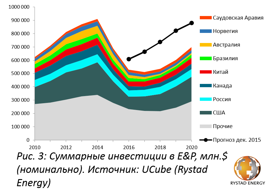 На рис.3 показана динамика мировых инвестиций в разведку и разработку c 2010 по 2020 гг. в разбивке по крупнейшим странам-инвесторам. Также на графике показан прогноз Rystad Energy за декабрь 2015 г. Суммарные инвестиции стабильно росли с 2014 г. и достигли $900 млрд. Вследствие последовавшего за этим быстрого падения цены нефти, нефтегазовые компании были вынуждены пересмотреть свои инвестиционные решения на будущие годы. В результате, затраты в сегменте upstream снизились на 24% в 2015 году. Эта тенденция также продолжилась и в 2016 году, суммарные инвестиции за год составили около $530 млрд., на 13% ниже, чем ожидалось в декабре 2015. Среди стран, снизивших инвестиции в наибольшей степени – США и Канада, где сокращение в 2016 году составило 41% и 26%, соответственно. Основной причиной снижения инвестиций в этих странах являются сланцы, по которым наблюдалось значительное снижение буровой активности. Более того, вследствие переноса сроков ожидаемых крупных открытий в Австралии, инвестиции в 2016 году снизились на 45%, что на 16% больше, чем ожидалось ранее. Значительное снижение наблюдалось также и в Бразилии, Китае, и Норвегии. Вследствие продолжительного периода низких цен на нефть, суммарные инвестиции в E&P вряд ли продемонстрируют положительную тенденцию также и в 2017 году. В настоящее время Rystad Energy ожидает постепенное увеличение цены нефти и положительные тенденции по инвестициям в 2018 г. и далее. Рост, однако, будет более медленный, чем ожидалось ранее, поэтому инвестиции в E&P не вернутся к историческому максимуму в течение следующих 4 лет.