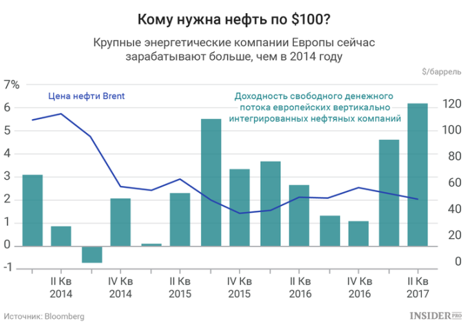 В первой половине этого года, при средней цене барреля Brent в районе $52, свободный денежный поток компаний в Европе был больше, чем в первой половине 2014 года, когда Brent стоила $109.