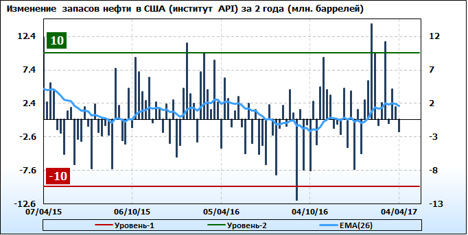 Изменение запасов нефти в США (институт API). Данные на 4.04.2017