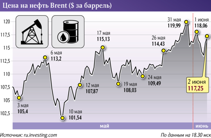 В ожидании решения ОПЕК+ и после его объявления нефтяные котировки росли. На 14:30 мск 2 июня августовский фьючерс Brent стоил около $113,5 за баррель, а на 18:45 мск — выше $117,5.
