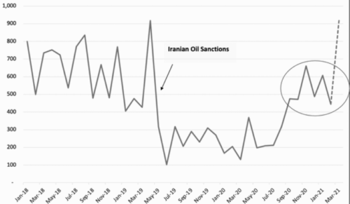 Вместе с тем, на прошлой неделе стало известно о массовых поставках иранской нефти в Китай. И, действительно, несколько иранских танкеров направились на восток.