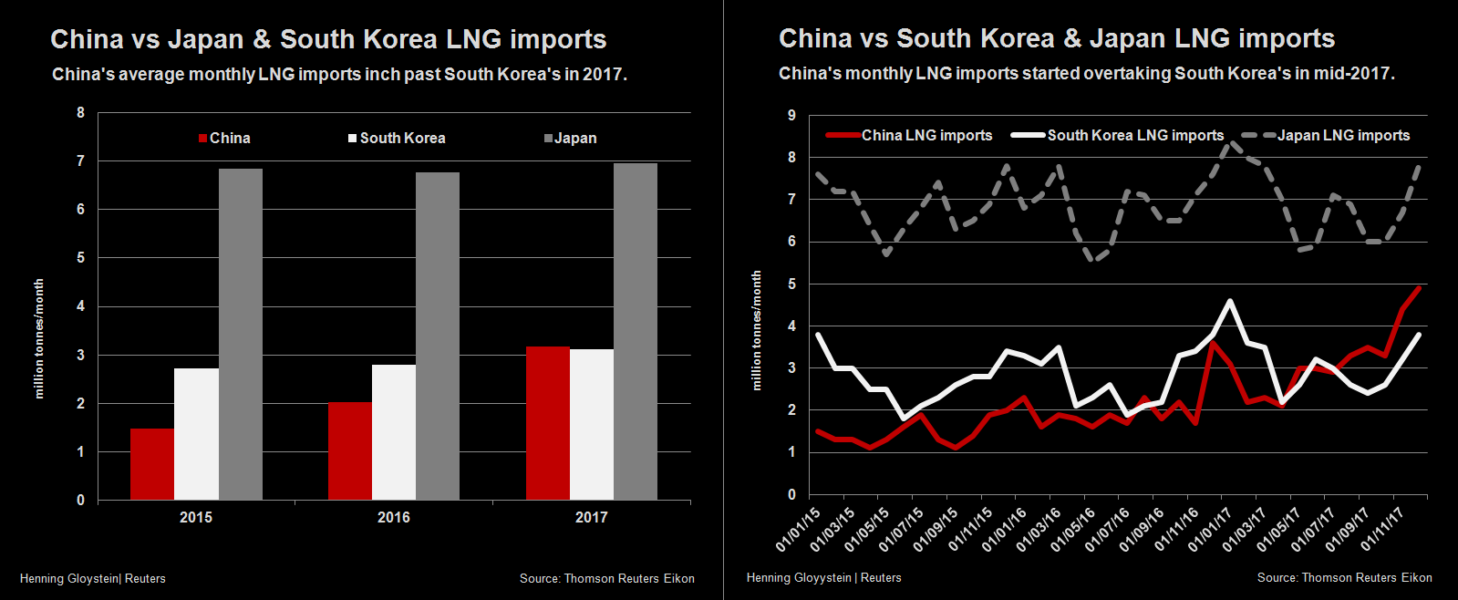 По данным Reuters, по импорту сжиженного природного газа в 2017 году Китай обогнал Южную Корею на 50%.