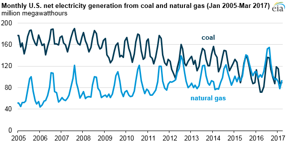 Рисунок 1: Выработка электроэнергии США из угля и природного газа (январь 2005 — март 2017).
