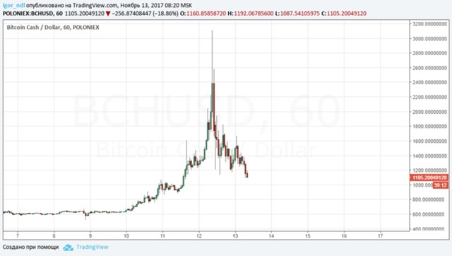 Наиболее любопытно, впрочем, выглядят движения в другой криптовалюте — bitcoin cash. В моменте она взлетала до $2450, однако продлилось это все недолго, и уже сейчас она стоит $1100. Волатильность просто запредельная: сначала взлет в 4 раза, затем падение более чем в 2 раза.