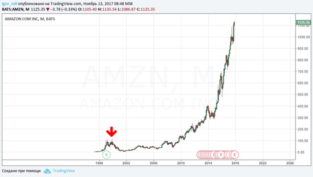 Однако, как мы уже сказали, есть и другие примеры. Возьмем акции Amazon. В конце 1990-х гг. котировки буквально с нуля взлетели до $100, а затем точно также рухнули обратно. Но это был еще не конец, так как сейчас одна акция Amazon стоит $1125.