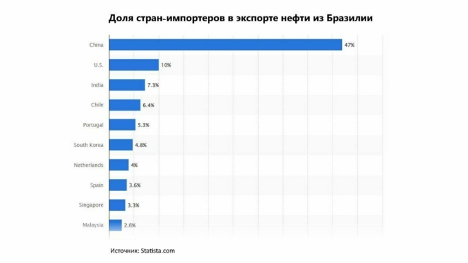 В 2021 году Китай закупал до 47% всей экспортируемой бразильской нефти. После него шли США (10%) и Индия (7,3%). Страны ЕС по отдельности были явно ниже по показателям, однако если взять главных европейских покупателей нефти из Бразилии вместе, то объем (12,9%) поставок был даже больше чем в случае с Соединенными Штатами. Для понимания о масштабах продаж: по состоянию на декабрь 2022 года экспорт нефти из Бразилии составлял примерно 1,7 млн б/с.