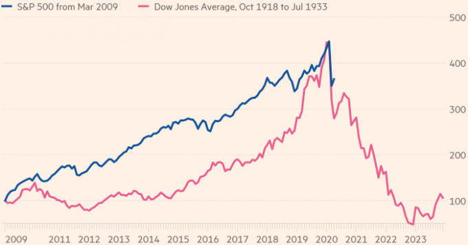 Динамика индекса Dow Jones в период с 1918 по 1932 годы крайне напоминает динамику индекса S&P 500 в период с 2009 года по нынешнее время (см. график выше — прим. ProFinance.ru), отмечает эксперт. Поэтому рынку акций еще только предстоит нащупать дно.