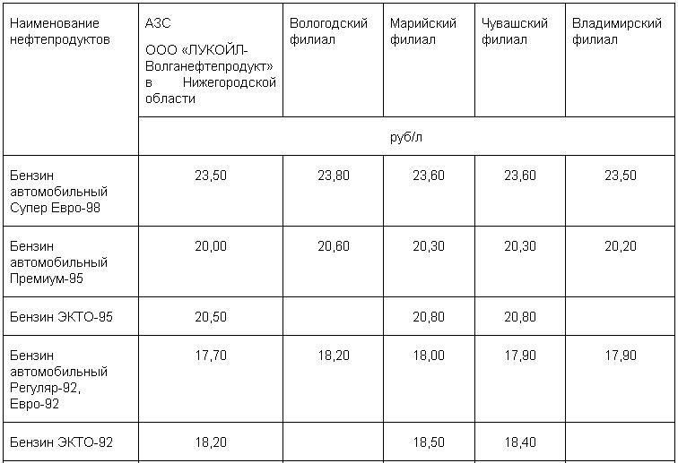 Cтоимость 1 л 95-го бензина и бензина ЭКТО-95 составляет соответственно: в Нижегородской области – 20 рублей и 20,5 рубля; в республике Марий Эл и Чувашии – 20,3 рубля и 20,8 рубля. Стоимость бензина Премиум-95 в Вологодской области – 20,6 рубля за 1 л, во Владимирской области – 20,2 рубля.