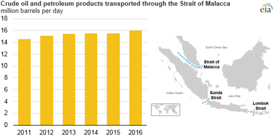 Одна треть из 61% всей мировой нефти и других жидких продуктов, которые транспортировались по морским путям в 2015 году, проходили через Малаккский пролив, второй по величине в мире, после Ормузского пролива. Объем нефти и других нефтепродуктов, проходящий через Малаккский пролив, увеличился четвертый раз в 2016 году, за последние пять лет, достигнув 16 млн. баррелей в день (б/д).
