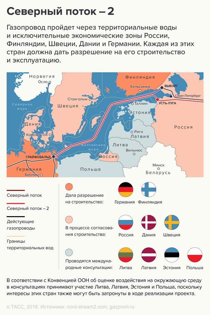 В четверг газета The Wall Street Journal сообщила, что президент США Дональд Трамп пытался убедить германского канцлера Ангелу Меркель отказаться от поддержки проекта «Северный поток — 2» во время их встречи, которая состоялась в апреле. Заместитель помощника госсекретаря США по энергетическим ресурсам Сандра Оудкирк в четверг заявила журналистам в Берлине, что США могут ввести санкции против компаний, в том числе европейских, принимающих участие в проекте «Северный поток — 2».