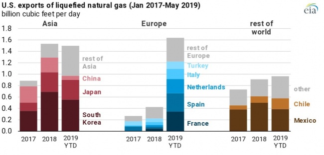 В информации говорится, что поставки американского сжиженного газа в Азию, которая была премиальным рынком, стали снижаться с февраля 2019 года по нескольким причинам: мягкая зима и возобновление работы АЭС в Японии. Кроме того, максимально упали поставки в Китай, который в прошлом году стал крупнейшим импортером газа в мире, опередив Японию и Германию. Как писало EADaily, поставки выросли на 32% — до 124 млрд кубометров. По данным EIA, в этом году Китай продолжил наращивать импорт, и за пять месяцев объем поставленного, например, СПГ увеличился на 20% (на 5,5 млрд кубометров). А вот экспорт сжиженного газа из США упал.