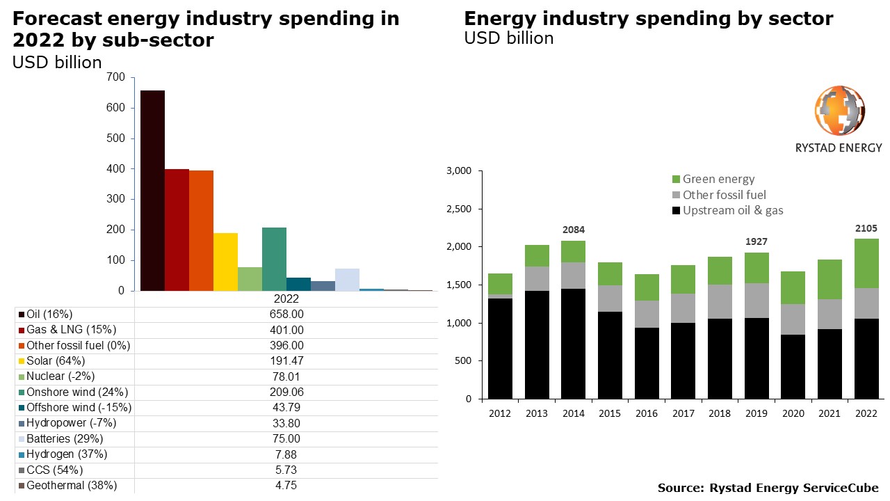По прогнозам, расходы на добычу нефти и газа в настоящее время вырастут на 16%, или на 142 миллиарда долларов, по сравнению с прошлым годом. Производители нефти и газа по всему миру увеличивают свои инвестиционные бюджеты для увеличения добычи. Что касается экологически чистой энергетики, то в 2022 году, исходя из текущего цикла проектов, глобальная мощность вырастет на 250 гигаватт в ветровой и солнечной энергии. Это приведет к росту расходов на экологически чистую энергетику на 24%, или на 125 миллиардов долларов.
