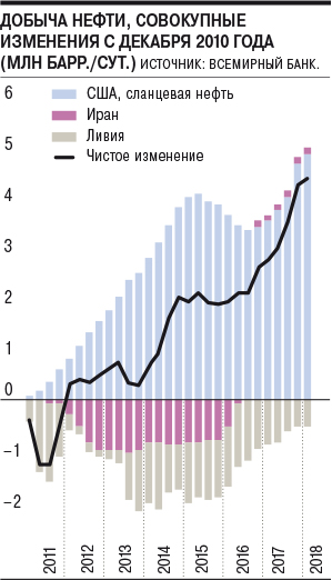 Сланцевая нефть производства США составляет лишь 6% мировой добычи, но именно она обеспечила почти половину роста глобальной добычи в 2010–2014 годах, причем скорость этих изменений оказалась недооценена аналитиками: Международное энергетическое агентство дважды пересматривало свой прогноз по США, напоминают в ВБ. Кроме того, этот феномен оказался в тени из-за геополитических потрясений на Ближнем Востоке: конфликта в Ливии, иранских санкций и опасений перебоев с поставками иракской нефти. Однако в 2014 году эти опасения рассеялись, а добыча сланцевой нефти продолжила рост до пикового значения — 5 млн баррелей в сутки в конце 2014 года, причем рост производства в США превысил весь рост мирового спроса. Решение же ОПЕК в ноябре 2014 года отказаться от контроля цен укрепило мнение рынка о значительном избытке предложения. Впрочем, слабый рост глобальной экономики во второй фазе кризиса — в течение 2015 года — означает, что спрос также сыграл свою роль в его генезисе, отмечают в ВБ.