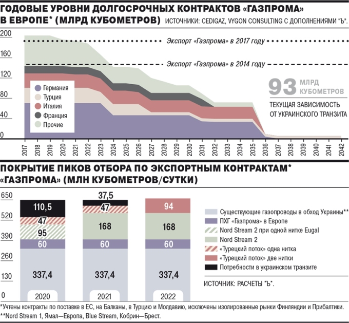 К началу 2015 года у «Газпрома» появился план: за счет постройки двух обходных газопроводов — «Северного потока-2» и «Турецкого потока» — сократить зависимость от украинской газотранспортной системы (ГТС) до минимума, чтобы иметь возможность вообще не продлевать контракт. План базировался на двух ключевых предпосылках: уровень экспорта «Газпрома» в Европу и Турцию останется примерно на уровне 2014 года, а оба газопровода будут готовы к концу 2019 года. Но к концу марта 2018 года стало очевидно: обе эти предпосылки не реализованы, и «Газпром» в любом случае должен будет либо продлить контракт с Украиной, либо пойти на самое масштабное в своей истории нарушение контрактов с потребителями.