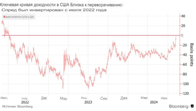 На рынках облигаций ключевой сегмент кривой доходности США, который был инвертирован в течение двух лет, близок к перевороту.