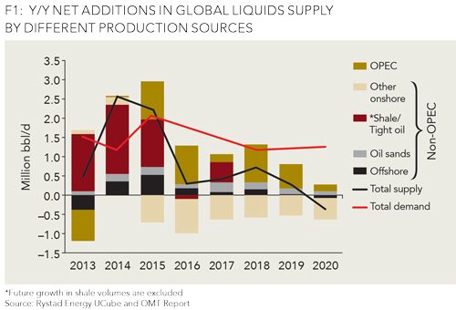 Революция в сланцевом производстве была фактором, способствовавшим обрушению цен на нефть в 2014 году. За период с 2013 по 2015 год североамериканское сланцевое производство выросло на 1,5 млн. баррелей в сутки. Эти объемы наряду с результатами инвестиционного цикла 2010-2014 годов привели к тому, что мировое предложение росло быстрее спроса как в 2014, так и в 2015 году. Предполагается, что в дальнейшем сланцевое производство будет являться ограничивающей силой в повышении цен на нефть, поскольку оно быстро реагирует на более высокие цены. Однако, изучая источники нового производства в среднесрочной перспективе, становится ясно, что сланцы являются единственным источником производства, который может добавлять необходимые объемы, чтобы не отставать от спроса.
