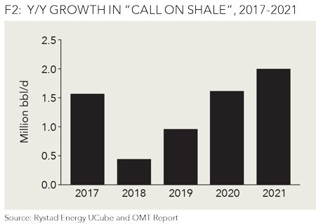 Рисунок 2 показывает необходимый годовой рост сланцевого производства, чтобы сбалансировать предложение и спрос с 2017 по 2021 год. Чтобы достичь этого, сланцевое производство должно вырасти на 1,6 млн. баррелей в сутки в 2017 году и более 2 млн. баррелей в сутки в 2021 году. Это подразумевает общий объем добычи сланцевой нефти в 2021 году равный 14,1 млн. баррелей в сутки. Для достижения такого роста в сланцевом производстве количество скважин для добычи сланцевой нефти должно достичь 20 000 единиц в 2021 году, что в два раза больше числа пробуренных скважин в 2016 году.