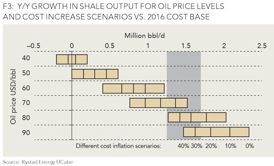 На рисунке 3 показан примерный годовой рост сланцевого производства в Северной Америке для различных цен на нефть WTI и сценариев инфляции по сравнению с уровнями затрат 2016 года. Выделенный раздел «Call on Shale» представляет собой средний показатель в 1.3 млн. баррелей в сутки, взятый из рисунка 2. Основное допущение для этого анализа состоит в том, что компании, занимающиеся разведкой и добычей, будут балансировать инвестиции с оперативным свободным денежным потоком (нейтралитет наличности). Например, при цене на нефть, равной $70 за баррель, требуется инфляция издержек в диапазоне от 0% до 25% для удовлетворения годового роста в 1,3 млн. баррелей в сутки в ходе «Call on Shale». При сценарии $50 за баррель производство может ежегодно расти всего на 0,5 млн. баррелей в день, даже если затраты остаются на прежнем уровне. Чтобы достичь спроса на горючие сланцы с годовым ростом около 1,3 млн. баррелей в день, цена на нефть должна переместиться в диапазон от $70 до $80 за баррель, чтобы компании оставались нейтральными с точки зрения движения денежных средств.