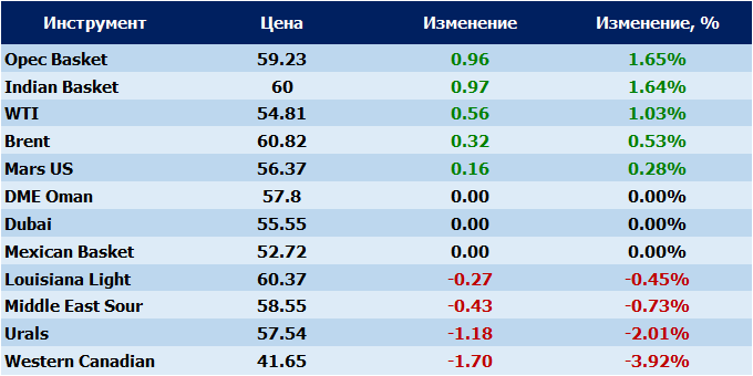 На Нью-Йоркской товарной бирже фьючерсы на нефть марки WTI с поставкой в декабре выросли в цене на 0,48% до $54,80 за баррель. На ICE Futures Exchange нефть марки Brent подорожала на 0,36% до $60,84 за баррель.