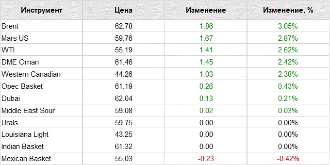 Стоимость фьючерса на WTI на март на электронных торгах Нью-йоркской товарной биржи (NYMEX) не изменилась к этому времени — $55,26 за баррель.