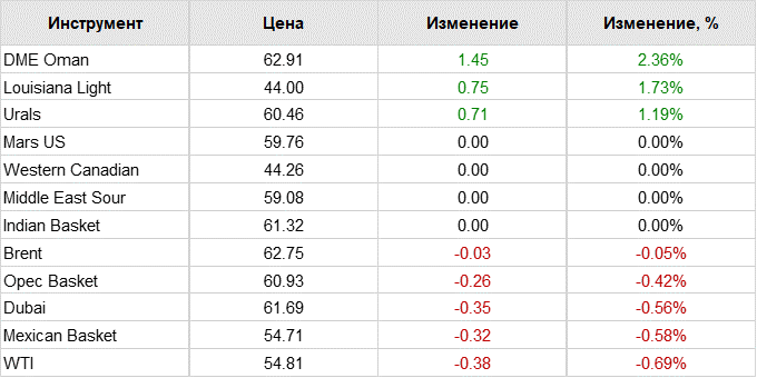 По состоянию на 7.44 мск цена апрельских фьючерсов на североморскую нефтяную смесь марки Brent росла на 0,46% — до 62,8 доллара за баррель, стоимость мартовских фьючерсов на нефть марки WTI повышалась на 0,55%, до 54,87 доллара за баррель.