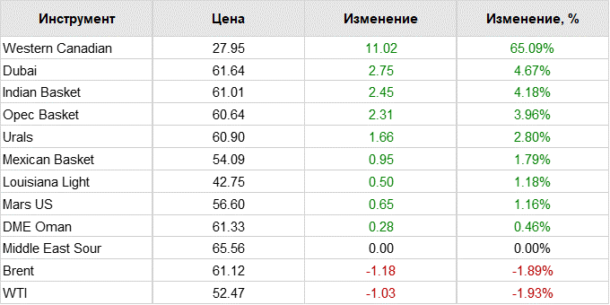 Стоимость фьючерса на WTI на январь на электронной сессии на Нью-йоркской товарной бирже (NYMEX) уменьшилась к этому времени на $0,88 (1,65%) — до $52,37 за баррель. По итогам прошлой сессии их цена увеличилась на $0,3 (0,57%), завершив торги на отметке $53,25 за баррель.