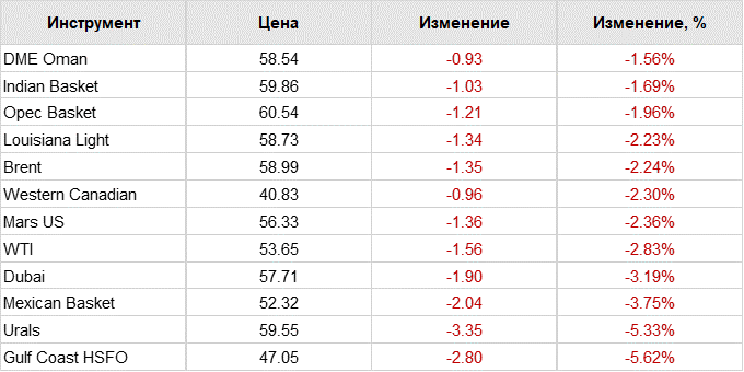Октябрьские фьючерсы на нефть марки Brent на лондонской бирже ICE Futures к 8:16 по Москве подешевели на $0,08 (на 0,14%) — до $58,86 за баррель. Во вторник их цена опустилась на $0,87 (на 1,45%), составив на закрытие $58,94 за баррель.