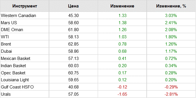 Цена нефти марки Brent впервые с 1 августа поднялась выше 63 долларов за баррель, об этом говорят данные биржи. Цена ноябрьских фьючерсов на нефть Brent выросла на 0,67 процента, до 63,09 доллара за баррель по состоянию на 3.23 по московскому времени. Цена октябрьских фьючерсов на нефть марки WTI стала больше на 0,81 процента и выросла до 58,32 доллара за баррель.