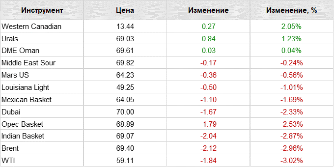 Цена фьючерса на нефть WTI на декабрь по итогам торгов 12 ноября снизилась на $0,26 (0,43%) — до $59,93 за баррель. По данным на 8:15 по московскому времени во вторник эти контракты подешевели на $0,83 (1,38%) — до $59,10 за баррель на электронных торгах Нью-йоркской товарной биржи (NYMEX).