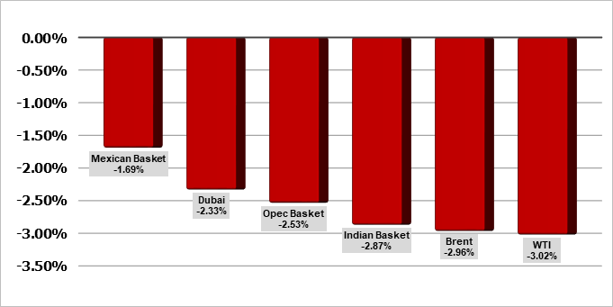 Нефть продолжает дешеветь во вторник на фоне падения рынков акций, укрепления доллара США и заявления президента США Дональда Трампа относительно планов сокращения добычи Саудовской Аравией, пишет MarketWatch.