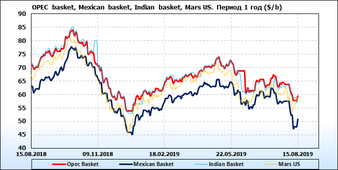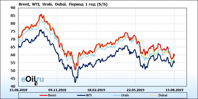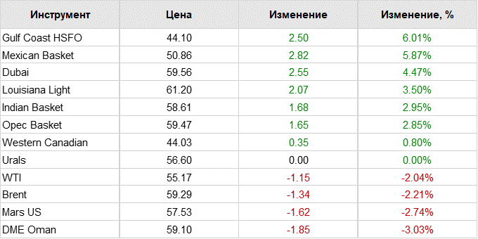 Цена на октябрьские фьючерсы нефти марки Brent упала до отметки $58,23 за баррель, следует из данных торгов на лондонской бирже ICE. Внутридневное падение цен превысило 5%. Спустя несколько минут нефть отыграла падение и вернулась к торгам на уровне $58,7–58,8 за баррель. Стоимость сентябрьских фьючерсов на нефть марки WTI уменьшилась на 4,94% — до $54,28 за баррель.