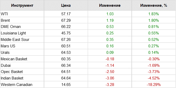 По состоянию на 7.57 мск стоимость январских фьючерсов на североморскую нефтяную смесь марки Brent росла на 0,84%, до 67,17 доллара за баррель, цена декабрьских фьючерсов на нефть марки WTI увеличивалась на 0,74%, до 56,88 доллара за баррель.