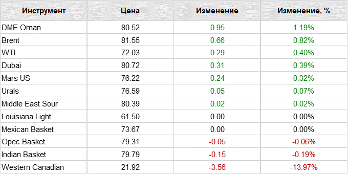 Цена фьючерса на нефть WTI на ноябрь на электронных торгах Нью-йоркской товарной биржи (NYMEX) увеличилась к этому времени на $0,10 (0,14%) — до $72,02 за баррель. По итогам предыдущей сессии контракты выросли в цене на $0,14 (0,2%) — до $71,92 за баррель.