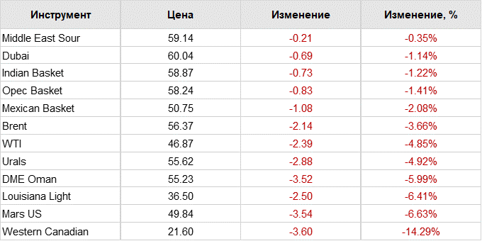Цены на нефть рухнули до минимума за 15 месяцев. Цена барреля североморской смеси Brent опустилась в район $56, WTI подешевела еще сильнее — котировки опустились ниже $46.