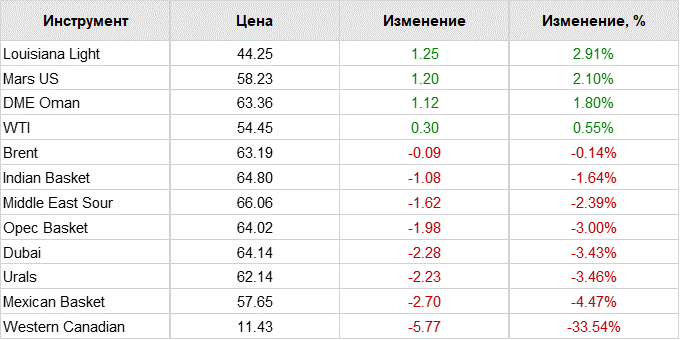 В среду рынок безуспешно пытался отыграть падение более чем на 6%, наблюдавшееся днем ранее: цены выросли, но недостаточно, что компенсировать такой обвал. По итогам сессии Brent поднялась на $0,95 (1,52%), и ее котировка на закрытие достигла $63,48 за баррель. Стоимость WTI увеличилась на $1,20 (2,25%), до $54,63 за баррель.