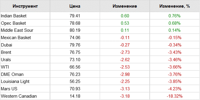 Декабрьские фьючерсы на Brent на лондонской бирже ICE Futures к 8:17 по московскому времени подорожали на $0,34 (0,44%) — до $76,78 за баррель. На торгах во вторник их цена рухнула на $3,39 (4,25%) и составляла на закрытие $76,44 за баррель.