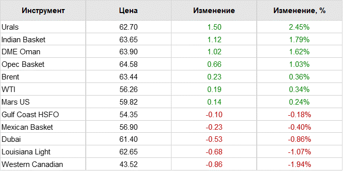 Сентябрьские фьючерсы на нефть WTI подорожали на 0,30% — до $56,19 за баррель. Фьючерсы на нефть марки Brent с поставкой в сентябре выросли на 0,11% — до $63,46 за баррель.